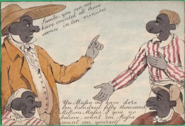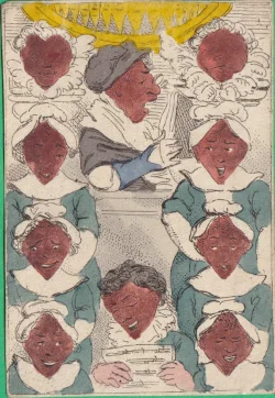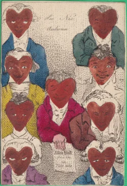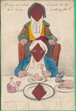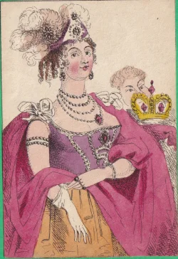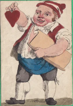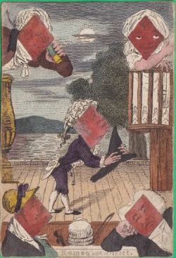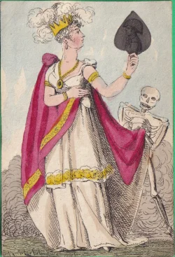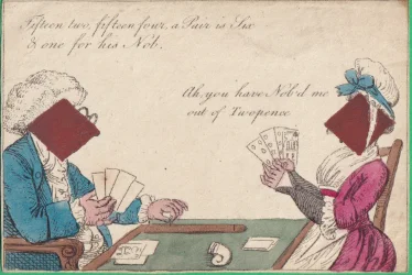 A wrapper for a Transformation pack showing a strewn pack of cards surmounted by a title card bearing the words "Metastasis, Transformation of Cards" Hand-coloured etching 1811 held in the British Museum